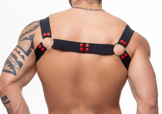 Harness Elastico Preto Com Argolas e Detalhe Vermelho